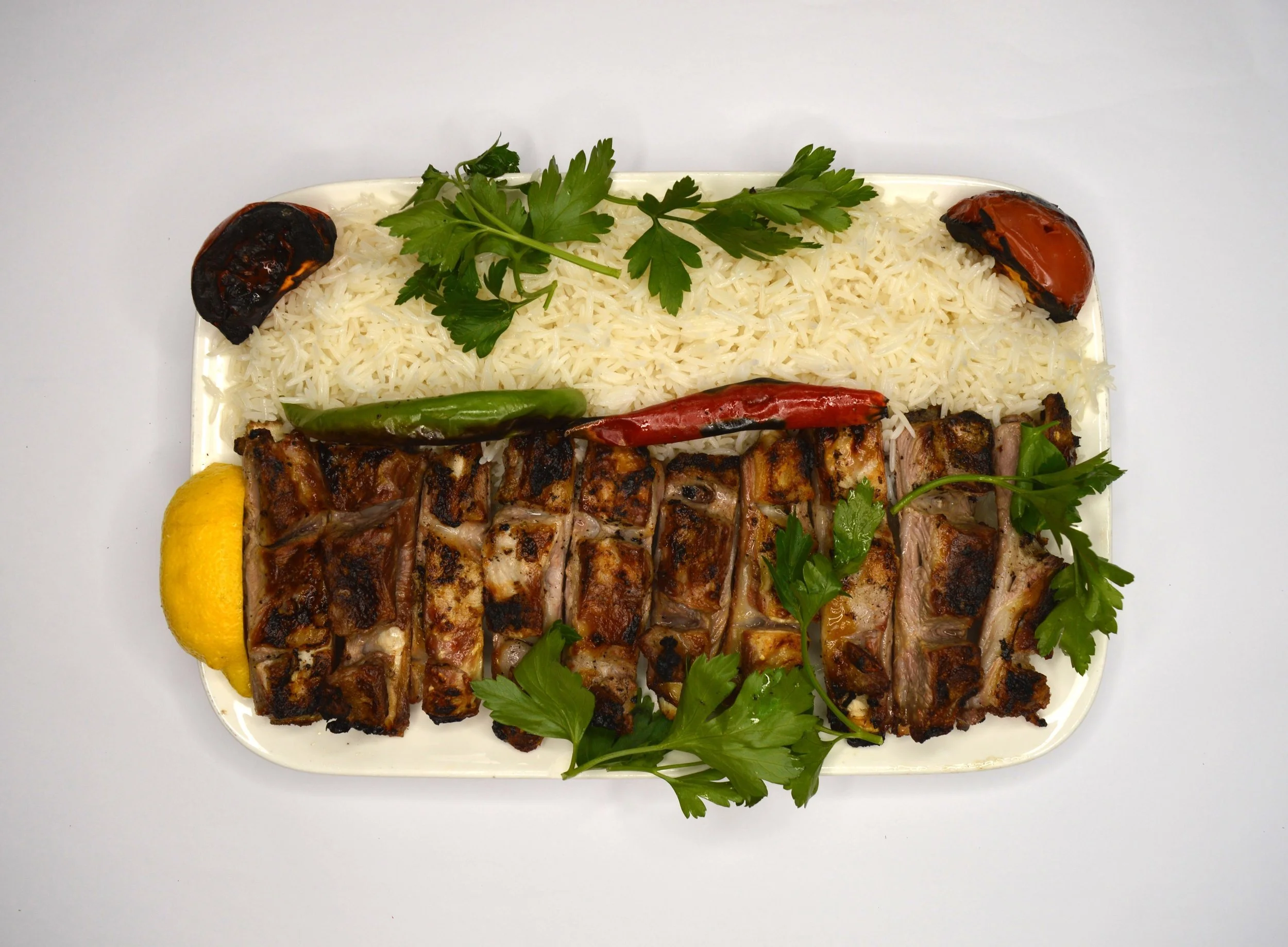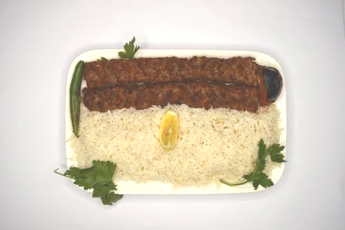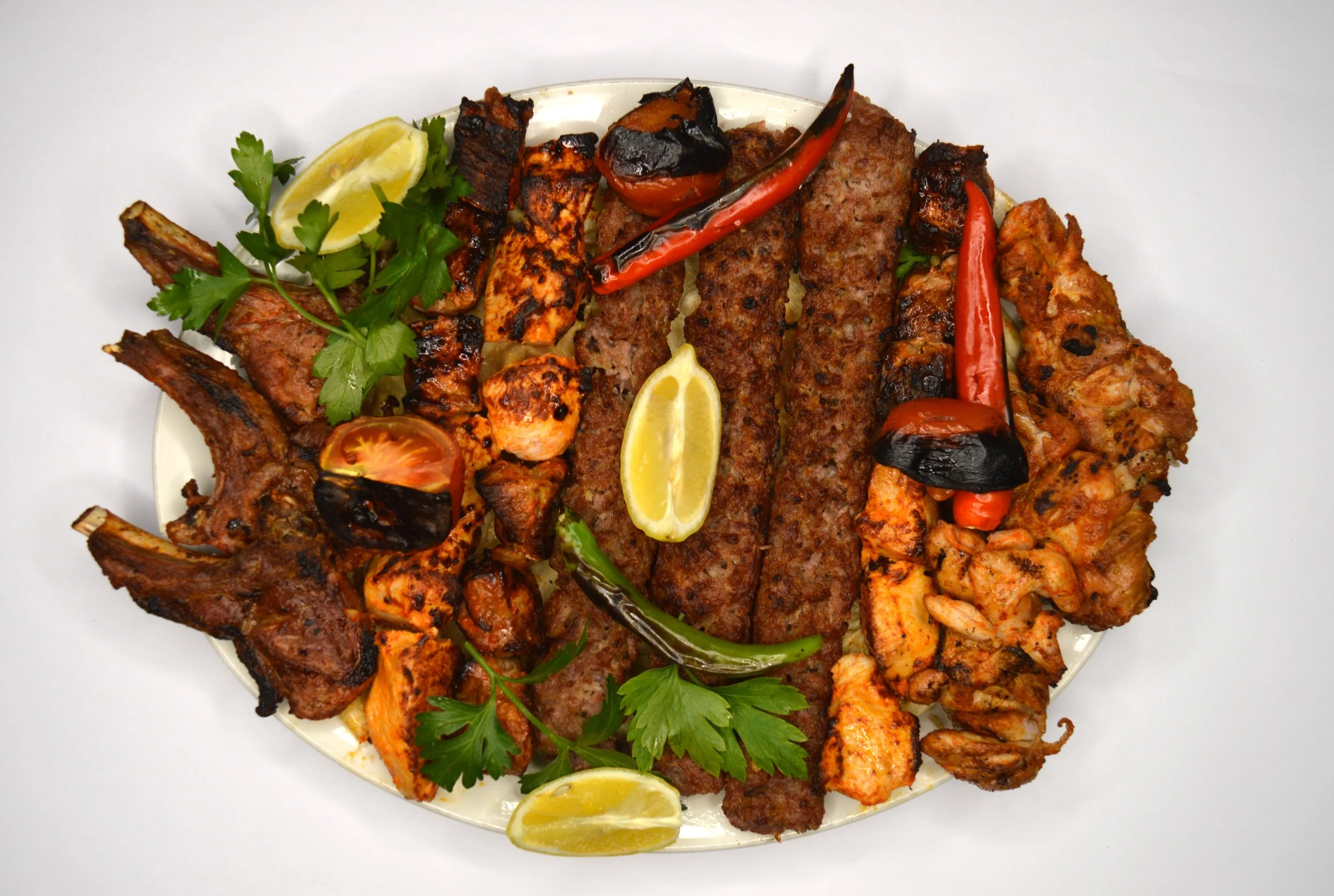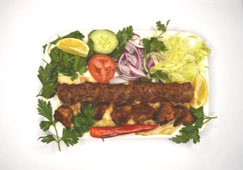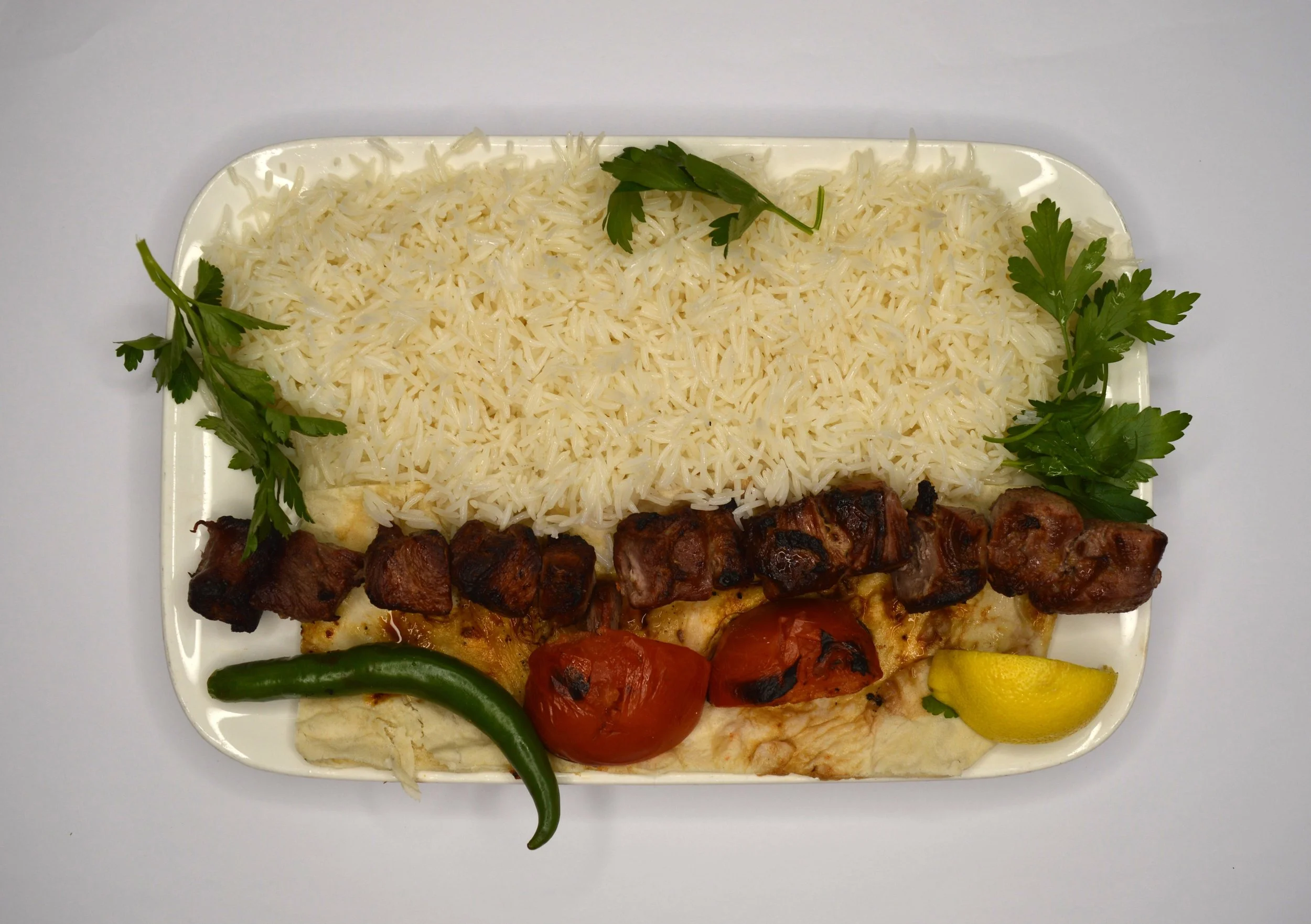 1.Spieß Gehackte Lamm, 1 Spieß Lammstück.,Gegrillte Tomaten, Peperoni, Salat oder Reis