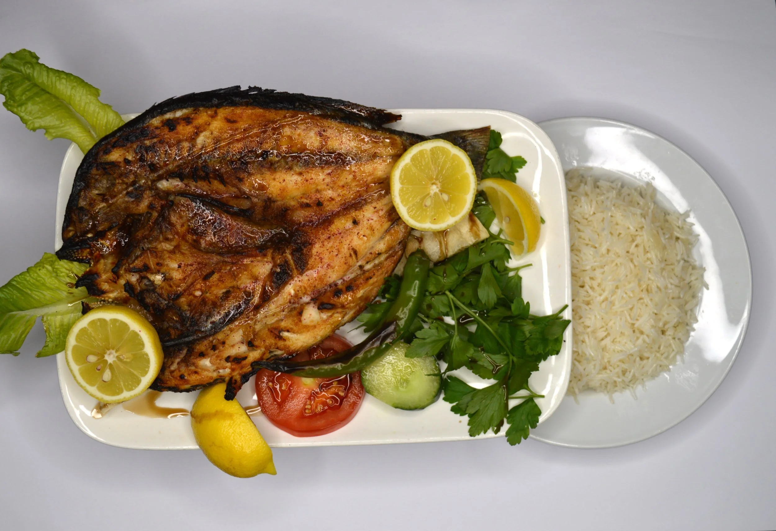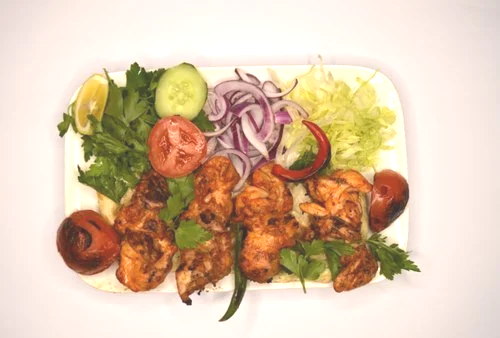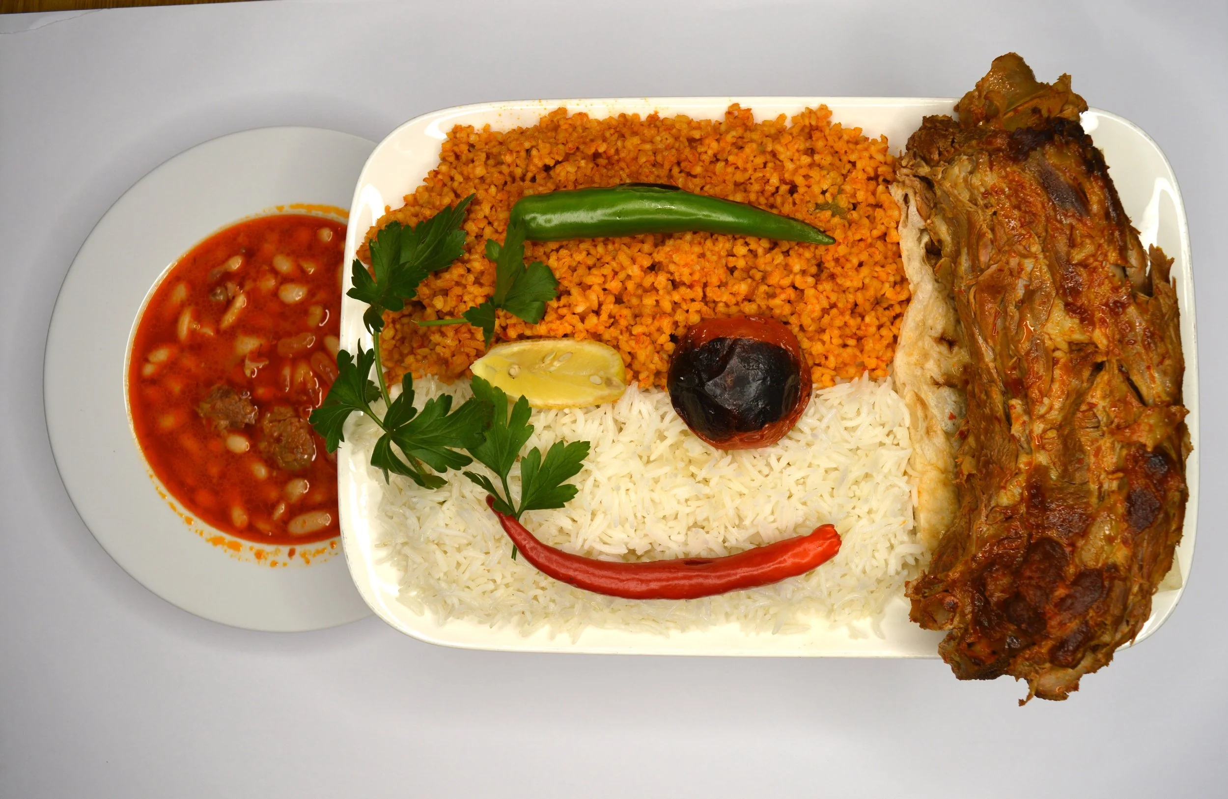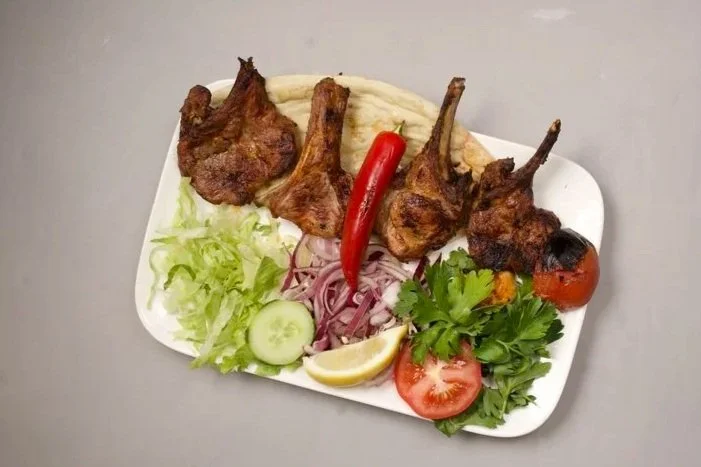 1.Spieß Gehackte Lamm, 1 Spieß Lammstück.,Gegrillte Tomaten, Peperoni, Salat oder Reis