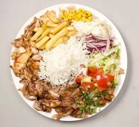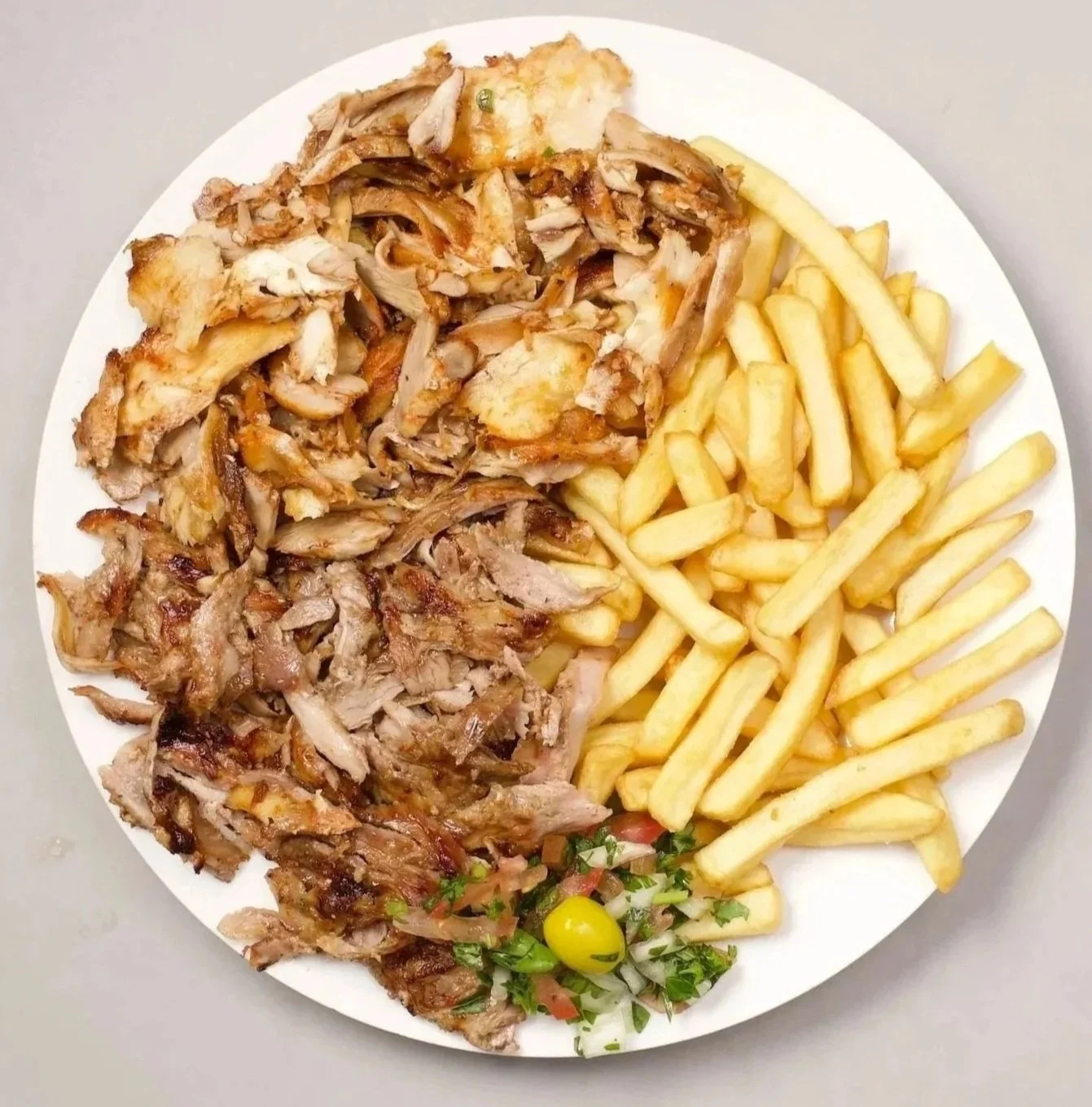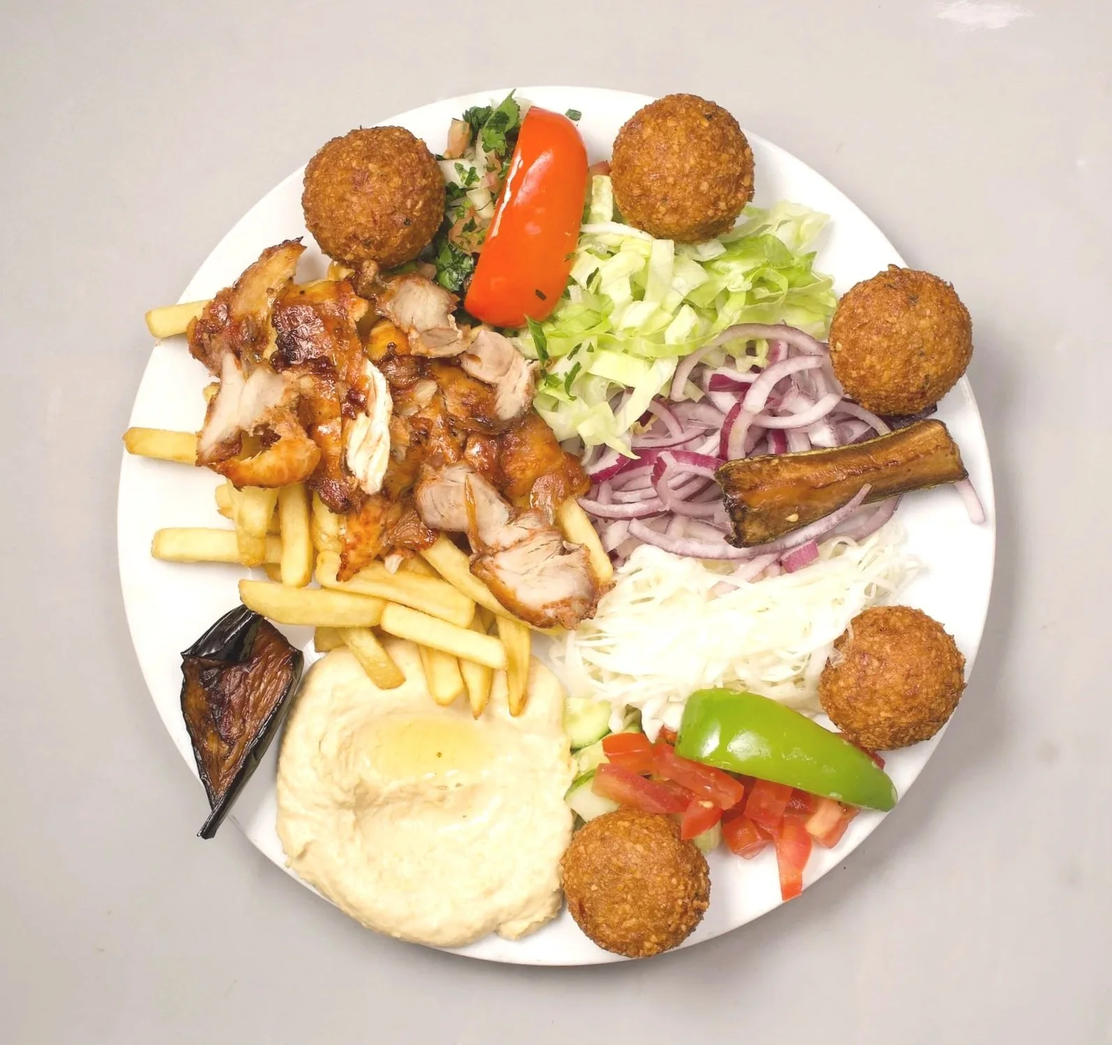 5 Stk.Falafel, Fleisch Hummos mit Salat & Sauce und Pomme