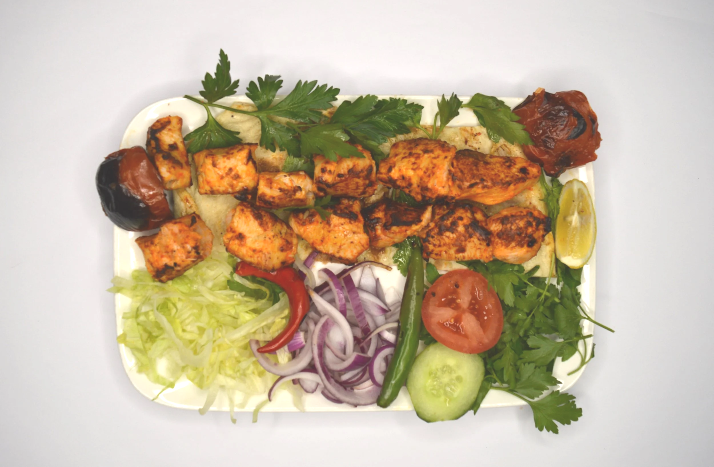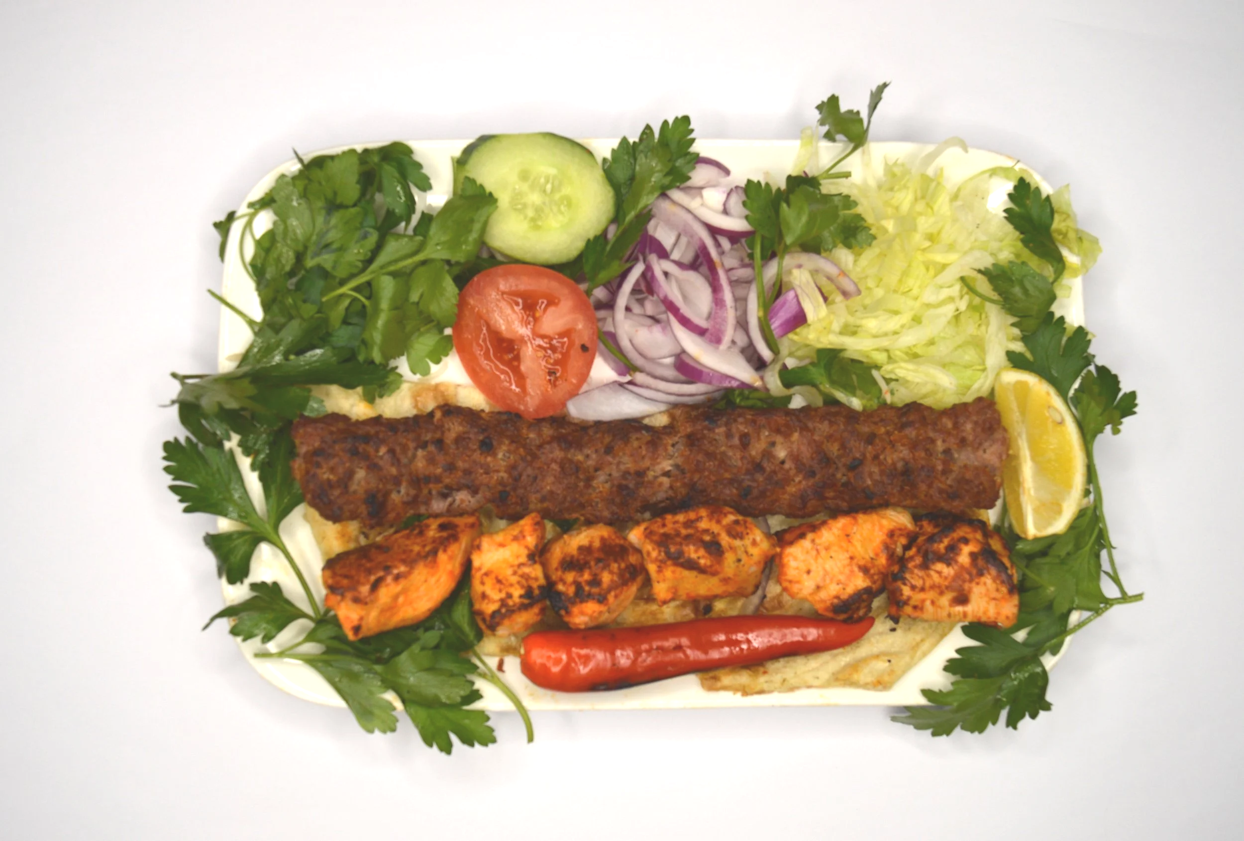 1 Spieß Gehackte Lamm, 1Spiß Hähnchenfilet. Gegrillte Tomaten, Peperoni, Salat oder Reis