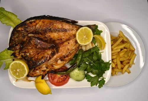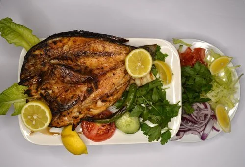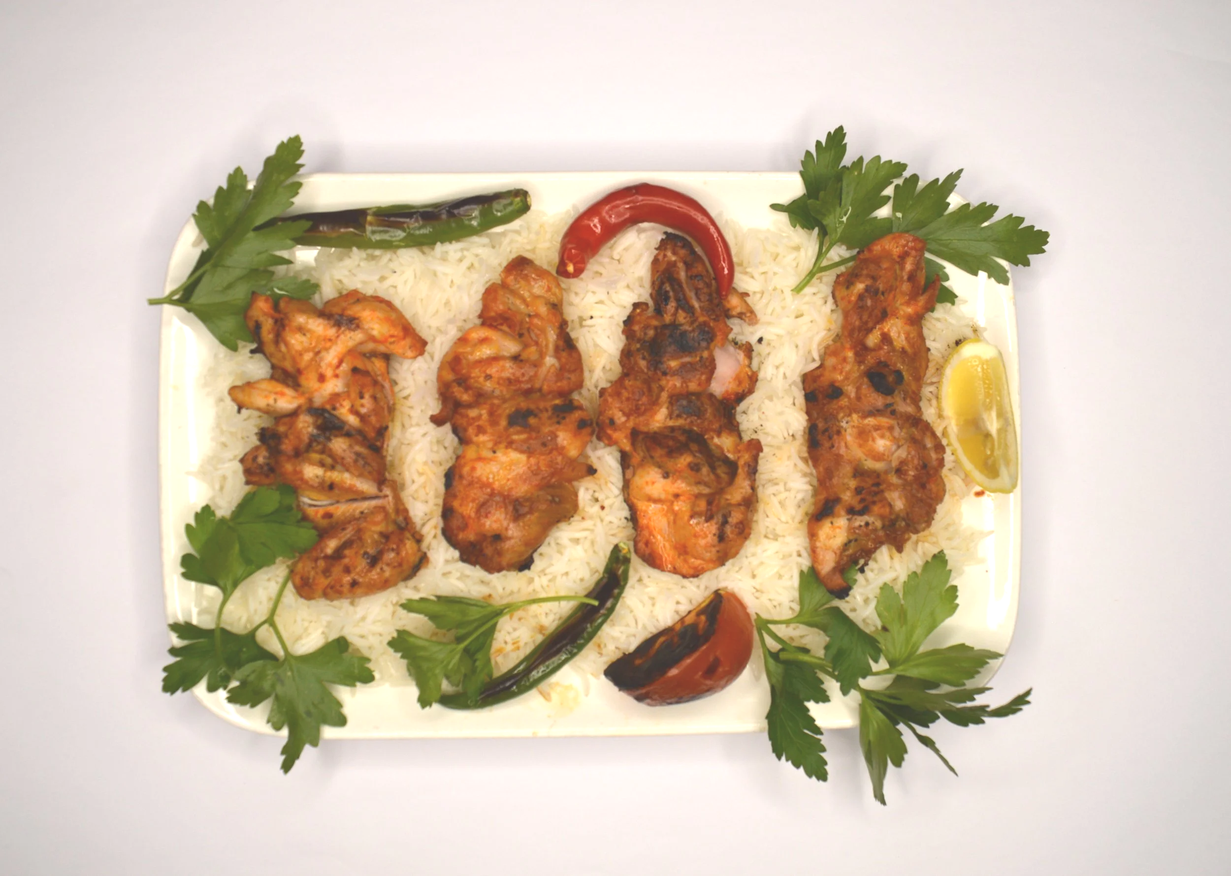 1 Hähnchenspieß, 2 Stk. Kotelett, 2 Stk. Hähnchenkeule Gegrillte Tomaten, Peperoni & Salat oder Reis