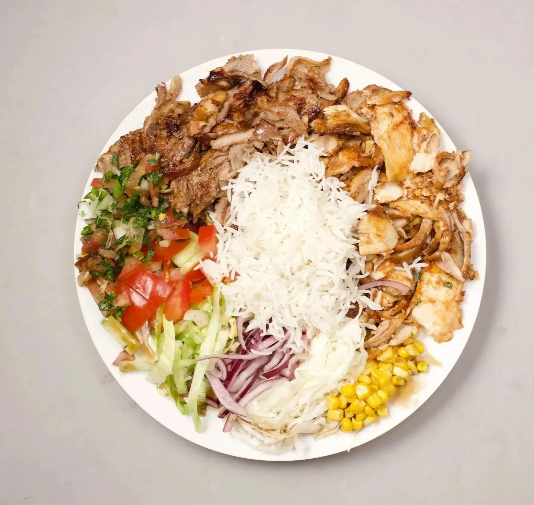 2 Gehackte Lammspieße, 1 ,Lammspieß, 1,Hähnchenspieß Gegrillte Tomaten, Peperoni, & Salat oder Reis